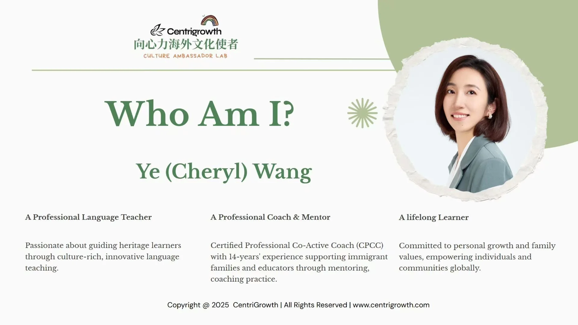 我是向心力(CentriGrowth)海外文化使者体系化中文语言文化项目的创始人,同时也是一名专业的共创式人生教练(CPCC)。我始终坚信:海外语言文化教育的核心,并非知识的单向灌输,而是借助语言这一工具和学习的过程,点亮每一个孩子内在的成长动力。我们所要做的,是营造一个开放、信任的空间,陪伴他们走向自信、舒展和完整,最终成长为真正想成为的自己。