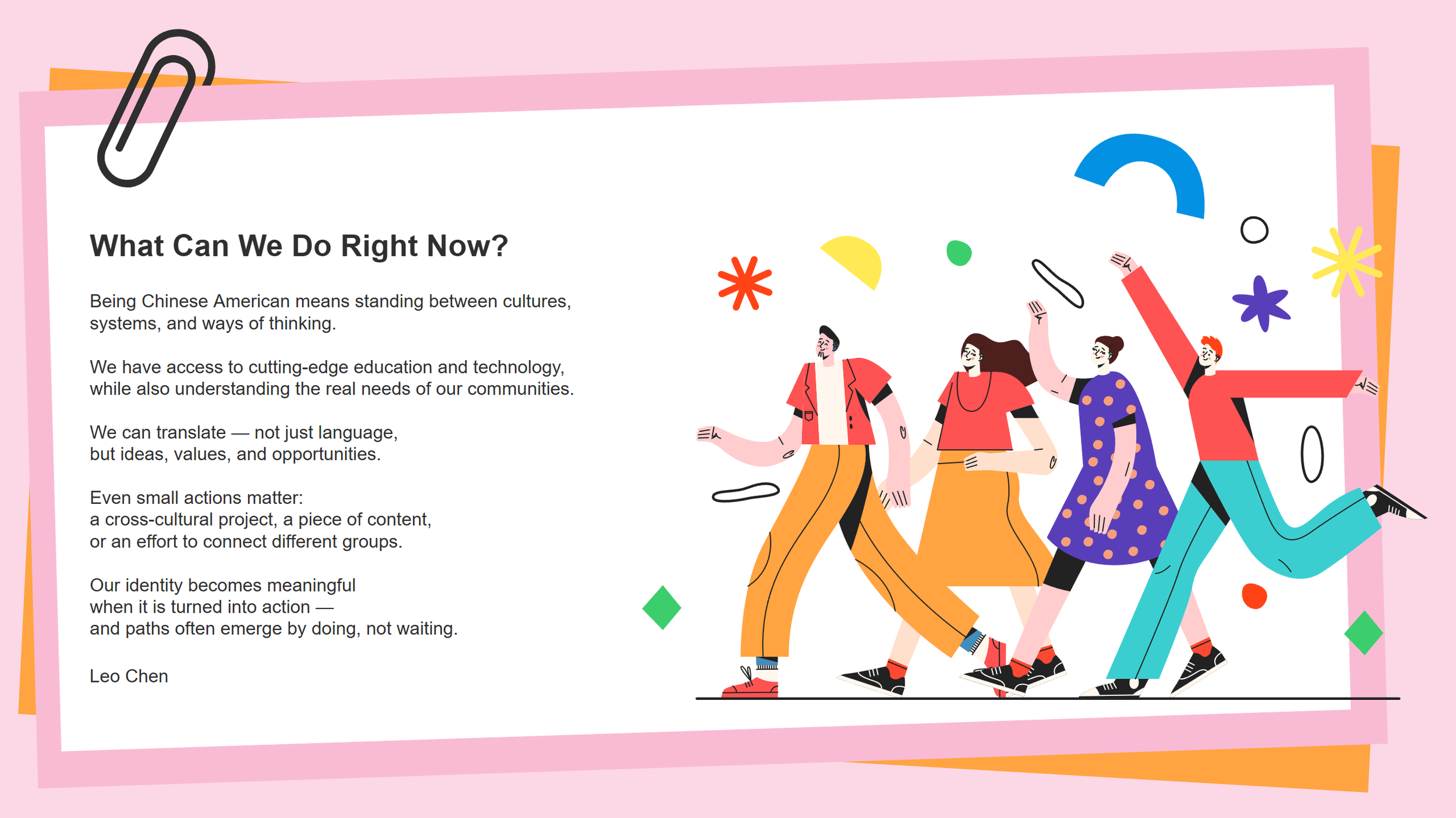 Leo Chen 以新生代大学生的视角,探讨“成功”的多元定义,并分享在专业选择、求职规划与身份认同上的观察。他鼓励美籍华裔学生跳脱传统框架,直面困惑、拥抱不确定性,将身份认同化为行动——无论是跨文化项目、内容创作或社群连结,都能为青年打开新的可能。他强调,成长来自探索与贡献,而非被动遵循剧本;未来需要大家主动行动与共同创造。