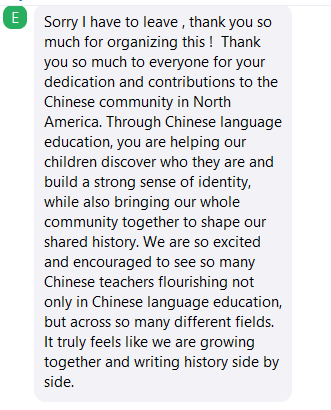 “Thank you so much for organizing this meaningful event. I’m truly grateful for everyone’s dedication to the Chinese community in North America. Through Chinese language education, you are helping children discover who they are, strengthening their sense of identity, and bringing our community together to shape our shared history.