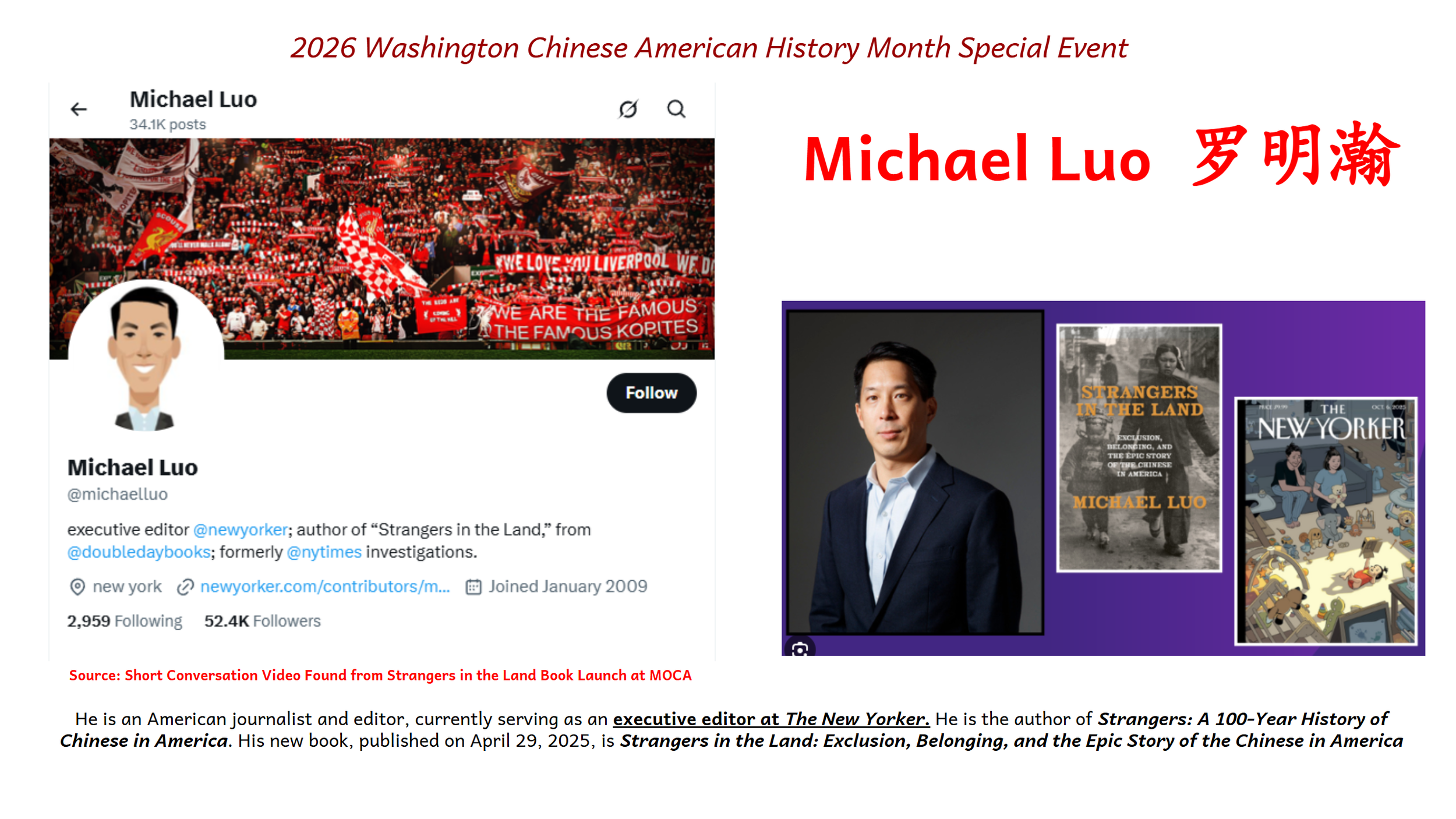 Over the course of more than two hours, the event began with participants watching a personal account from The New Yorker’s Executive Editor Michael Luo and learning about his newly published 2025 book Strangers in the Land: Exclusion, Belonging, and the Epic Story of the Chinese in America. From there, the guest speakers drew on their own lived experiences to share authentic stories of growing up Chinese American, their journeys of identity exploration, and their contributions to community development. The discussion centered on Chinese American identity, civic engagement, youth development, and the future of the community, sparking enthusiastic responses from participants across the United States.