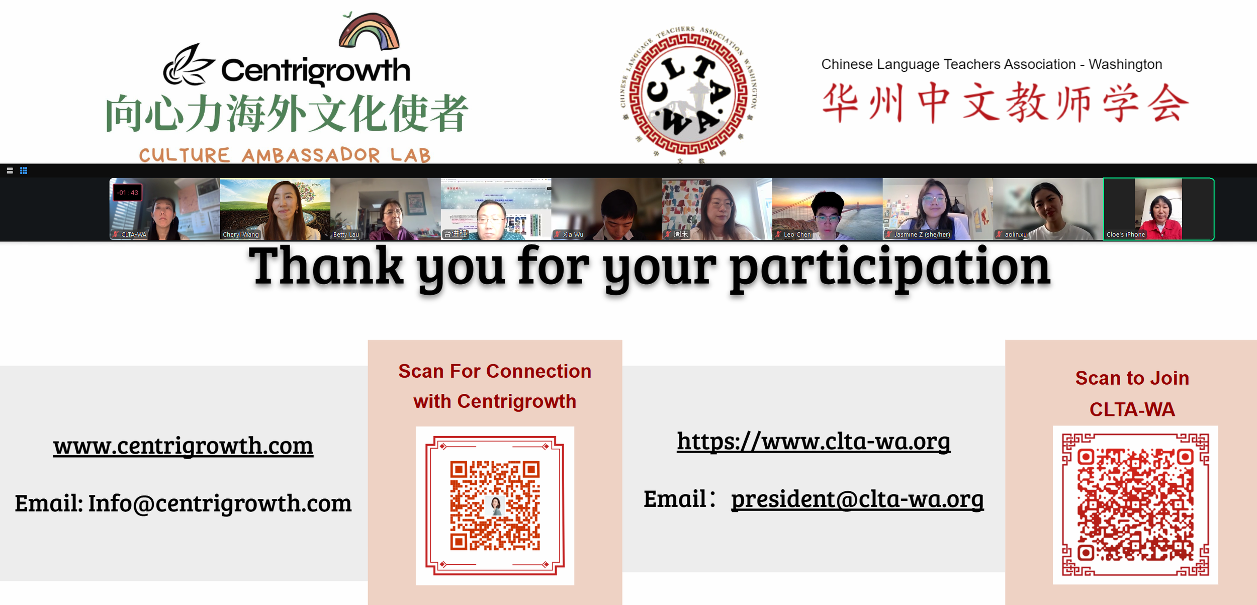 The event was co-organized by Cheryl Wang, founder of the Centrigrowth Culture Ambassador Lab, together with the Chinese Language Teachers Association in Washington State (CLTA-WA) , and supported by organizations across multiple states and sectors. In her opening remarks, Cheryl introduced the origins of Chinese American History Month, the advocates behind the legislation, and recent approving progress of the related bills, such as SB 5574 & SB 5134, etc. She then invited representatives from three generations of Chinese Americans to engage in a deep dialogue. The speakers—ranging from veteran educator Betty Lau, a long‑time advocate for Chinese American rights and Chinese language and cultural education, to a former tech industry leader turned educator Mo Zhou, to young leaders Jasmine Zhu, Aolin Xu, and Leo Chen—embodied the power of intergenerational continuity and collective progress.