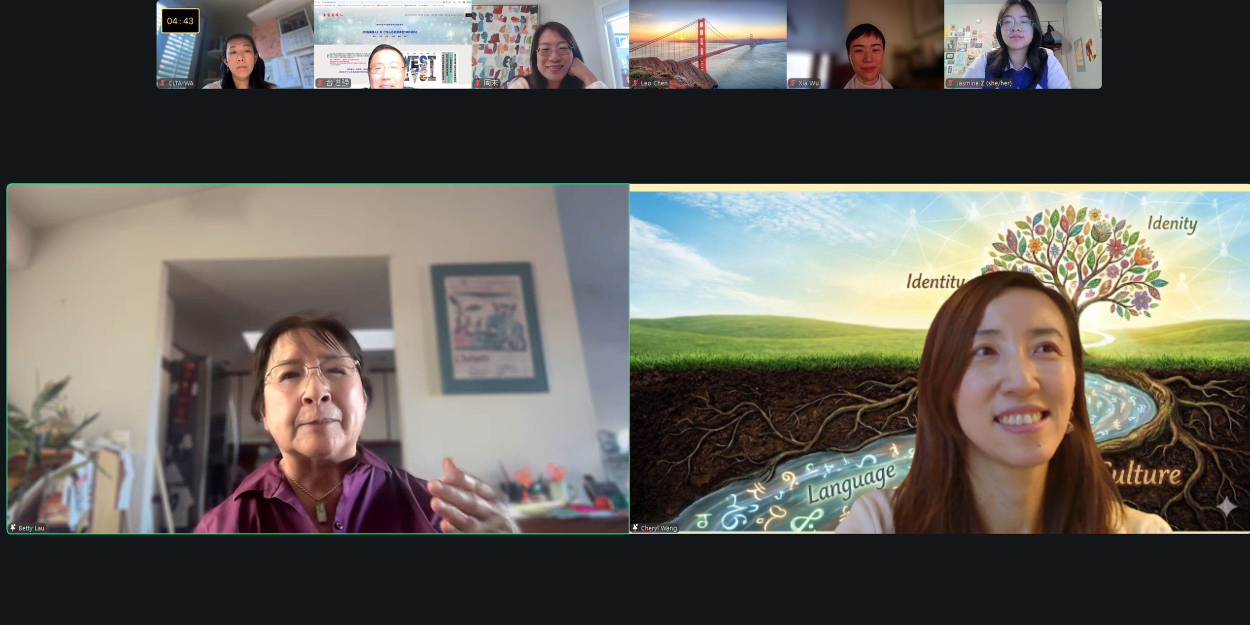 本次活动由向心力海外文化使者项目(Centrigrowth Culture Ambassador Lab)创始人王晔(Cheryl Wang)老师联合华州中文教师学会(CLTA-WA)共同策划,并由多州多领域组织协办。王老师在开场介绍了美华历史月的设立背景、推动者的努力及SB 5574、SB 5134等法案的最新进展,并邀请老中青三代华裔代表展开深度对谈。嘉宾横跨不同世代与领域,包括长期投身海外华人权益与语言文化教育的资深前辈 Betty Lau 老师、从海外软件行业领袖转向教育人的周沫老师,以及新生代青年代表 Jasmine Zhu、Aolin Xu、Leo Chen,充分展现跨世代传承与共同前行的力量。