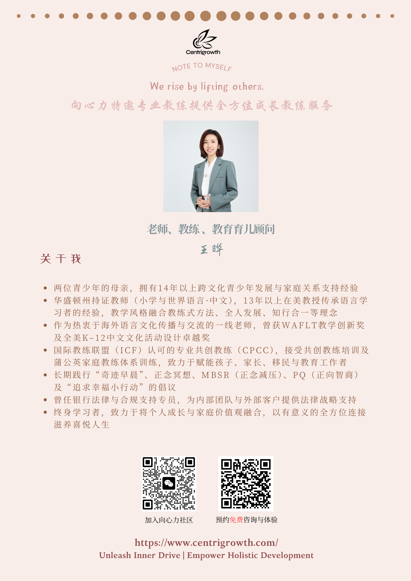 如果你也在经历情绪上的挑战,正在探索工作与家庭的平衡点,渴望真正读懂孩子与家人,也更懂得自己,欢迎点击下方链接🔗与我预约🆓半小时咨询,或体验个人或家庭教练对话: